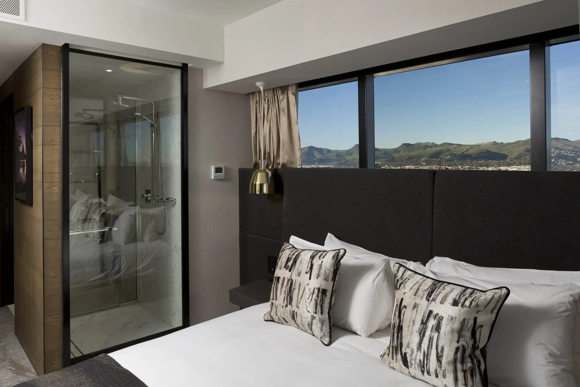 Our suites are located between the 5th, 6th, 7th, and 8th floors, covering 46 square metres with amazing views from the city to the coast, to Port Hills, and onto the extraordinary Southern Alps.